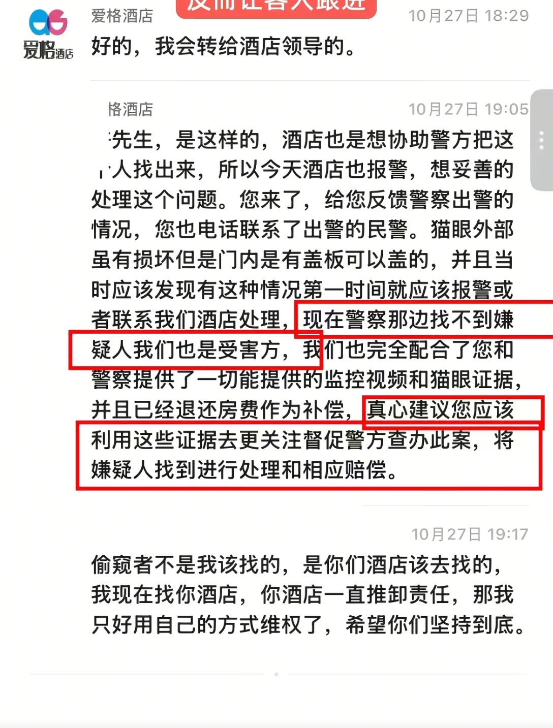 该工作人员表示,女房客房门的猫眼的确坏了,但内侧有挡板,从外边是看不到房内情况。“警方已在处理,如果她确实受到伤害或者损失,我们不会逃避。”