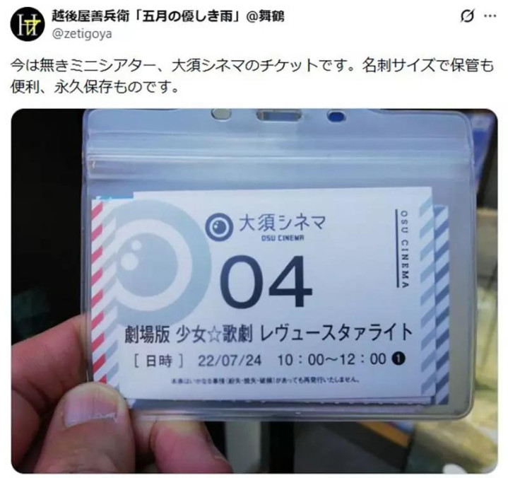 有人晒出了已经倒闭的小型影院 大须Cinema 的票根,名片大小,刚好能放进收藏夹里。