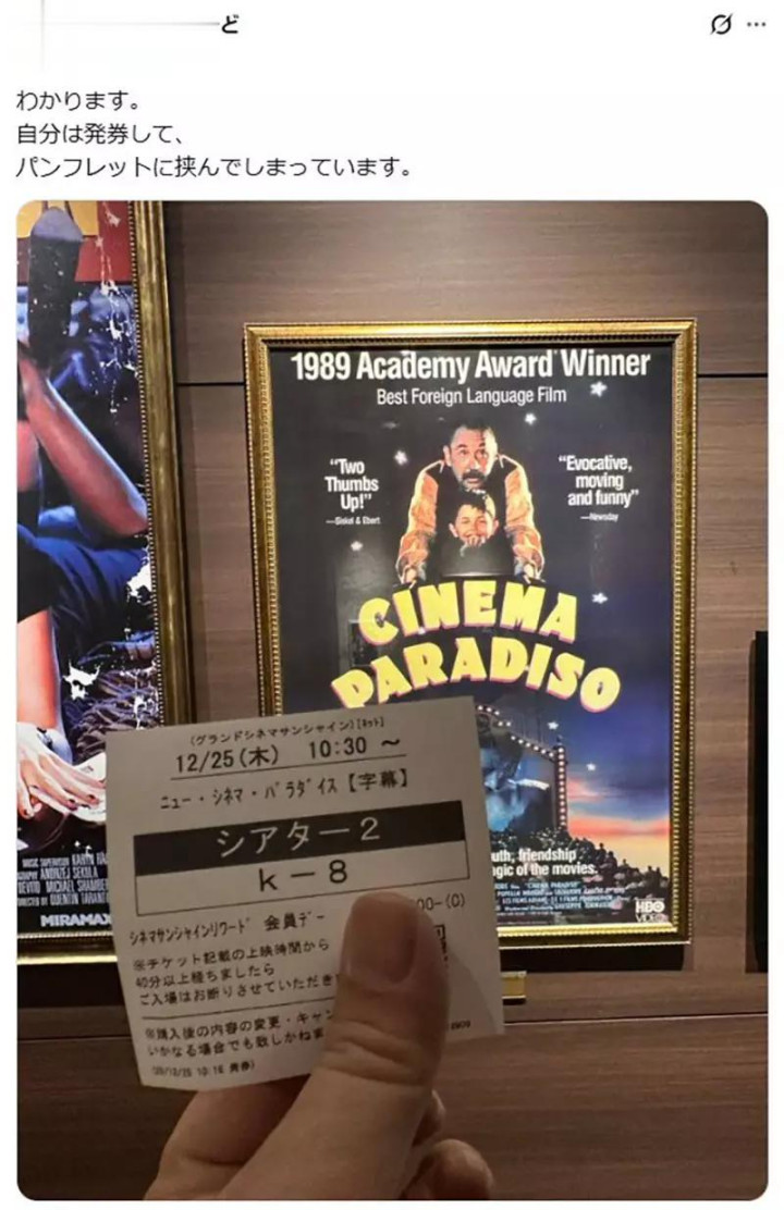 他在 X(原推特)上发文表示:即便现在很多电影院都已经支持二维码入场,他还是会特意选择实体票券,只为了收藏那张票根。
