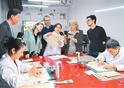 意方专家在中国历史研究院图书档案馆文献修复室参观了解该馆古籍修复技术。 新华社记者 李 贺摄