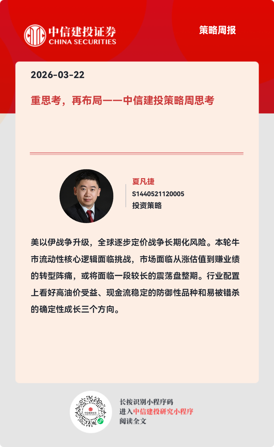 美以伊战争升级,全球逐步定价战争长期化风险。本轮牛市流动性核心逻辑面临挑战,市场面临从涨估值到赚业绩的转型阵痛,或将面临一段较长的震荡盘整期。行业配置上看好高油价受益、现金流稳定的防御性品种和易被错杀的确定性成长三个方向。重点关注板块包括:煤化工、新能源(风光锂电)、储能、核电、电网、煤炭、水电、AI(涨价链、缺电链)等。