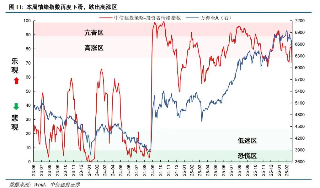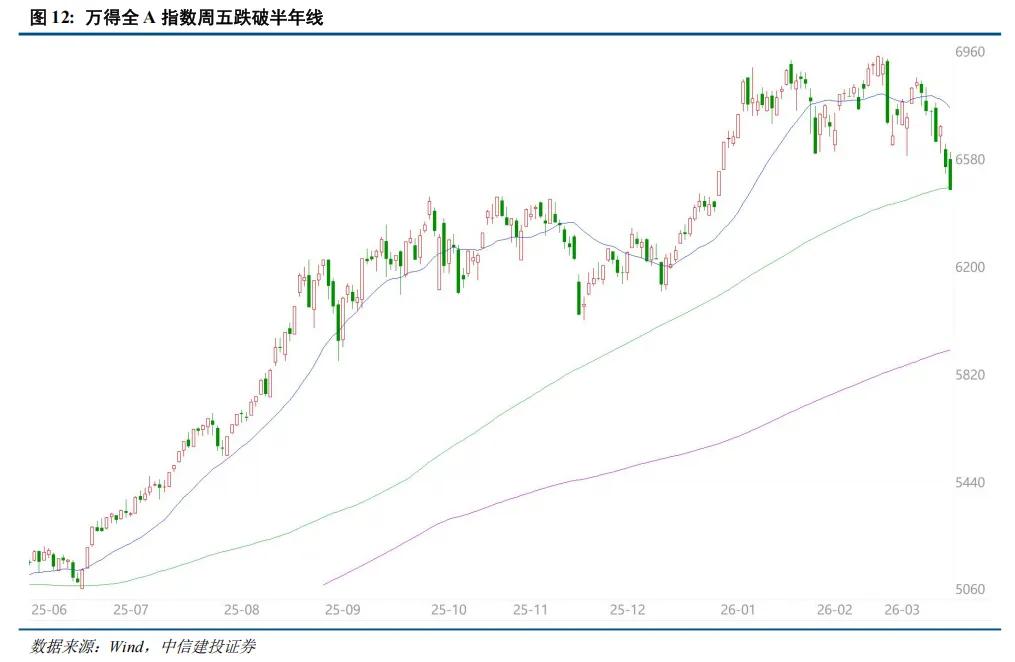 受外部地缘政治风险影响,我们构建并持续跟踪的投资者情绪指数本周再度下滑,跌出高涨区降至70附近。在牛市环境中,情绪指数跌至70往往意味着较好的左侧买入机会,不过当前的情况有所不同,万得全A指数已经跌破了半年线,这意味着市场震荡行情获得确认,70可能并非情绪指数的阶段性低点。考虑到情绪指数的快速下滑和美以伊战争持续升级的风险,预计指数将进一步向下寻找支撑,建议短期控制仓位、多看少动,等待反弹时点。