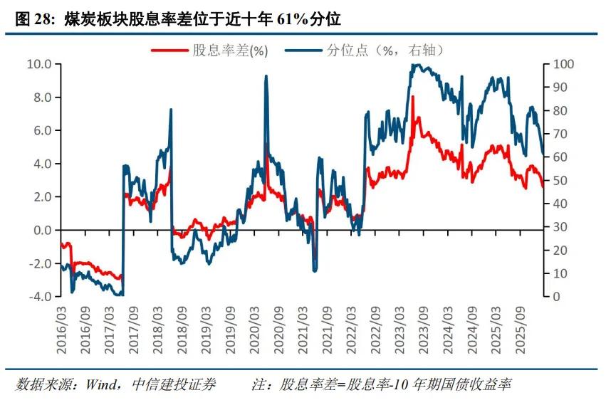 现金流稳定的防御性品种煤炭随着油气价格中枢的长期上移,煤炭板块或将迎来价值重估。一方面,煤化工利润扩张和“以煤代油”的逻辑下,煤炭需求有望获得大幅改善。另一方面,煤炭受制于产能周期和供给刚性,为煤炭供需紧平衡形成内生支撑。供需共振有望推动煤炭迎来量价齐升。虽然长协价机制平抑了煤价的向上暴涨弹性,但也封杀了大幅下跌的空间,增强了煤企业绩的可预测性与稳定性。在市场波动的环境下有望提供稳定的现金流和较好的防御性。目前煤炭板块股息率差位于近十年61%分位,处于偏高水平。