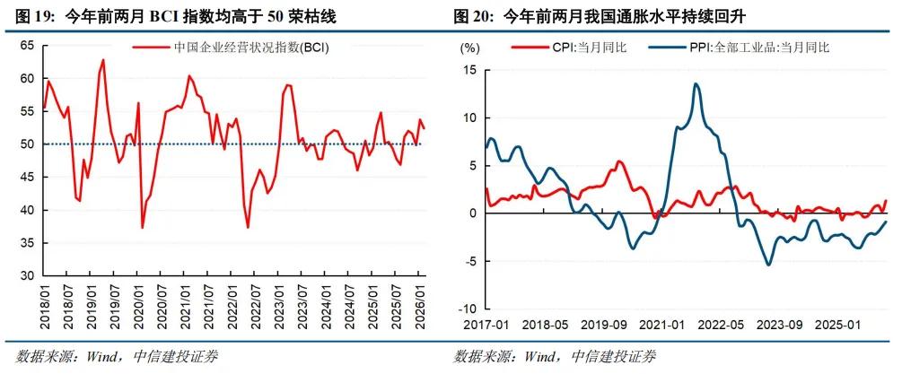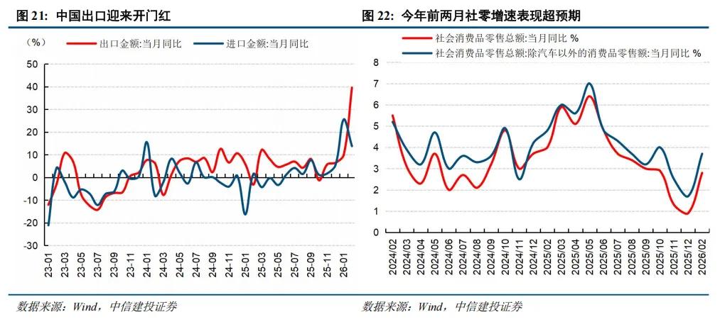 虽然流动性推动的估值逻辑面临挑战,但正如我们此前在年度策略展望中指出的,牛市下半场,市场将从涨估值转向涨业绩(消化估值)。如果业绩增长预期仍然良好,A股牛市就有望持续。不过在增长预期确认之前,市场将面临从涨估值到赚业绩的转型阵痛期。从今年开年两月主要宏观经济指标来看,出口强势、物价回升、财政前置发力、社零消费超预期,一季度有望迎来“开门红”。不过前两月数据受春节假期等因素影响较大,市场仍然关注开工季之后物价回升和需求改善情况。全球能源危机背景下,前文分析的出口成本优势和全球需求抑制正反影响交织,可能对经济的回升带来一定的不确定性。后续可进一步关注外需变化和政策发力情况。我们认为虽然短期全球经济不确定性上升,但从长期来看中国迎来战略机遇期,凭借“煤炭+新能源”的双支柱能源底座,中国能源产业、制造业和人民币资产都有望受益(详见上周策略周观察《中东局势影响深远,中国迎来战略机遇》)。