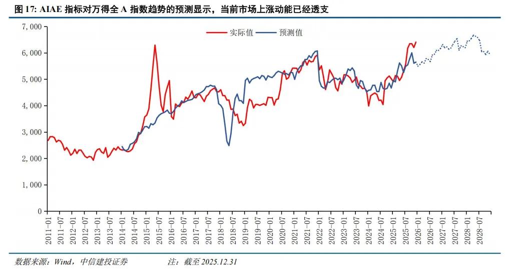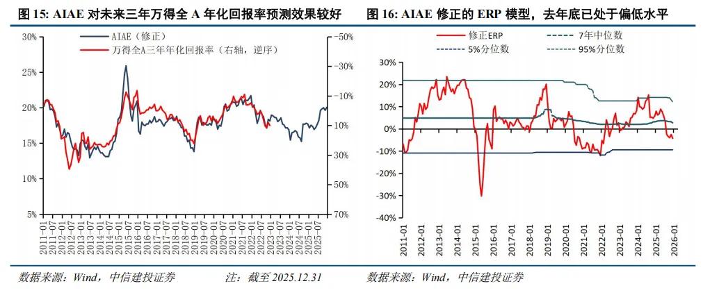其次,中长期择时我们曾给出一个较为有效的指标AIAE(详见策略专题《什么是AIAE——中长期A股择时指标的构建与应用》)。该指标最新一次更新在今年1月底,数据更新至去年12月底(万得全A点位与当前相近)。我们计算出的AIAE(修正)在去年下半年大幅上升,即投资者对权益资产的配置比例较高,这削弱了权益资产未来三年的回报预期。我们的模型显示,以去年年底为基准,未来三年万得全A年化回报率预期为-2.47%。以AIAE指标修正的ERP模型(股权隐含风险溢价模型)也在去年年底降至偏低水平,经历年初两月的上涨后ERP可能已在2月底接近下沿。另外,AIAE指标预测的万得全A指数趋势也显示,当前市场点位已经明显超出模型预估,市场上涨动能或已透支。因此,从长视角,市场或将面临一段较长的震荡盘整期。