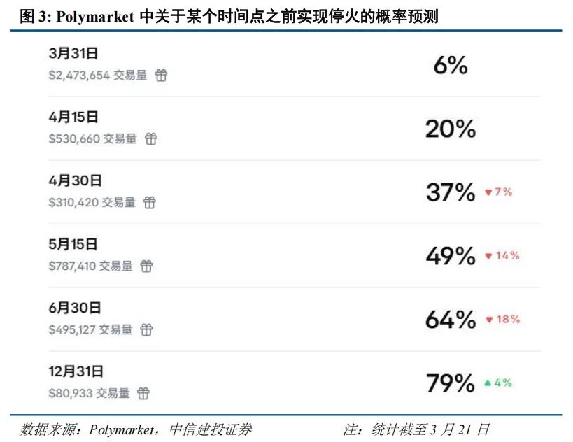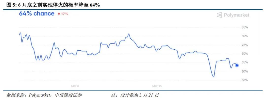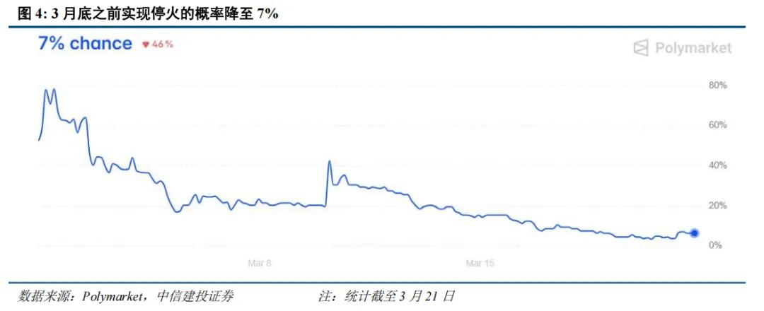 那么市场有没有认识到战争的长期化呢?我们参考美国博彩网站Polymarket的预测数据,可以看到,目前市场预测3月底之前停火的概率不到7%,4月底之前停火概率仅37%,战火持续到下半年的概率也达到36%。我们认为,全球市场都将逐步定价战争的长期化。