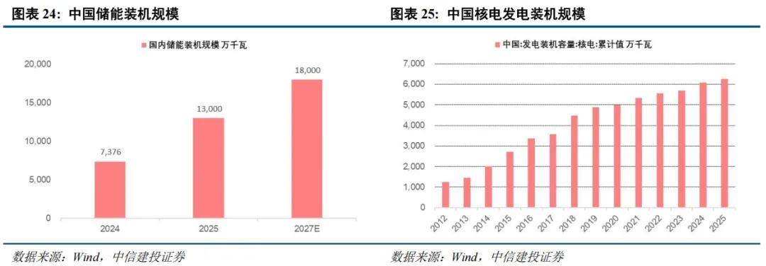 新能源、储能、核电、电网中国在光伏、风电、电动汽车、储能等领域已形成全产业链优势,在新型电力系统建设方面也走在世界前列。欧洲在经历俄乌冲突后,对中东油气依赖度显著提升,此次美伊冲突直接暴露其能源脆弱性,推动各国从多元化油气来源,转向全面拥抱可再生能源。英国自2026年4月1日起取消对中国33类海上风电核心部件的进口关税,德国也向中国风电企业开放市场,这为中国新能源装备出口创造了历史性机遇。新能源转型必然同时带动储能、核电、电网等配套建设。根据国家发改委、国家能源局印发的《新型储能规模化建设专项行动方案(2025—2027年)》,计划2027年全国新型储能装机规模达到1.8亿千瓦上。3月10日中国宣布加入《三倍核能宣言》,目标到2050年将全球核能装机容量增至2020年的三倍。
