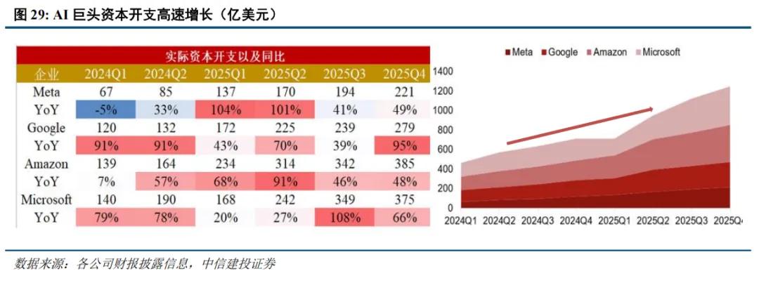 水电以水电为代表的公用事业板块,一方面以稳定的现金流和较低的历史波动率为资金提供防御避险的选择,另一方面也受益于全球HALO交易,实物资产重估的逻辑。特别是水电和绿电行业不受燃料价格上涨带来的成本上行压力,业绩稳定、确定性较高。易被错杀的确定性成长AI涨价链、缺电链从海外产业链与云厂商指引看,AI算力相关资本开支仍处于加速兑现阶段。以Meta为例复盘头部公司资本开支指引,2025年三季报发布已经连续9次上调指引,上调近400亿美元。26年预期全年大幅上调,同比上升近60%。Meta占比约19%,按照1350亿美元测算,则四巨头全年Capex约7105亿美元(yoy+92.85%)。