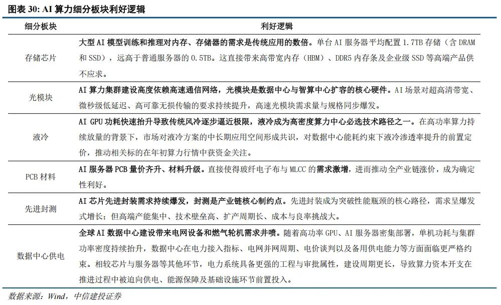 2026年AI算力基建体量巨大,巨额消耗上游材料,将引发整个产业链的供不应求及涨价,利好存储芯片、光模块、液冷、PCB材料(玻纤电子布、MLCC)、先进封测,数据中心供电(电网设备、燃气轮机)等。不过,随着市场情绪降温,部分资金转向防御品种,AI算力等确定性成长板块易在资金调仓过程中被错杀,建议关注板块波动和其中错杀的机会。