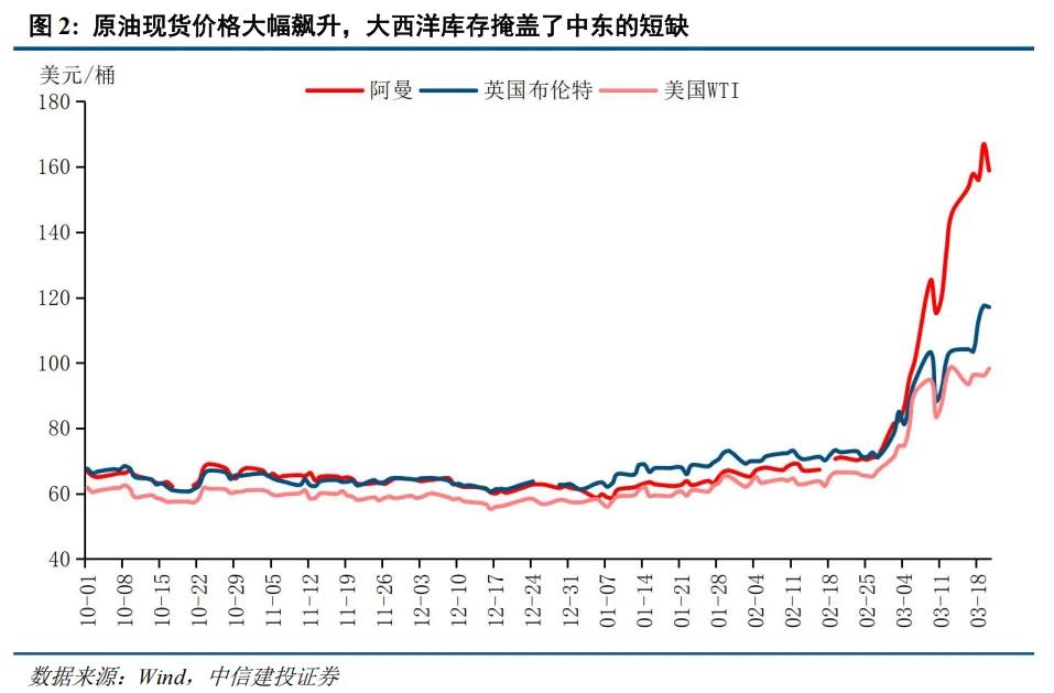 战争对经济的冲击已经显现,全球油价大幅飙升,不过涨幅各不相同,期货价格上涨落后于现货,大西洋两岸油价则远远落后于中东。本周美国WTI原油现货价格升至98美元/桶,英国布伦特原油现货价格升至117美元/桶(期货价格为104美元/桶),而位于中东的阿曼原油现货一度突破166美元/桶(最新约为158美元/桶)。美欧长期形成的战略储备和商业库存掩盖了中东的原油短缺,缓解了大西洋两岸的紧张情绪。不过亚洲国家如东南亚地区、印度、韩国、日本等首当其冲遭受了油气短缺的冲击,现货成本高企的情况下,部分需求正在退出市场。中国则凭借充足的战略储备、多元化的原油进口来源和领先的电气化转型受到的冲击较小(详见上周策略周观察,本文不再赘述)。未来,如果霍尔木兹海峡持续封堵,随着现有库存逐步消耗,全球油价都将向中东现货油价靠拢。