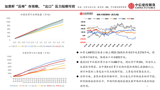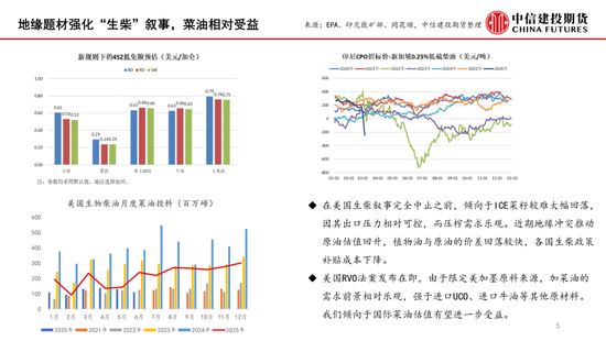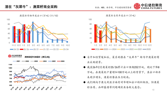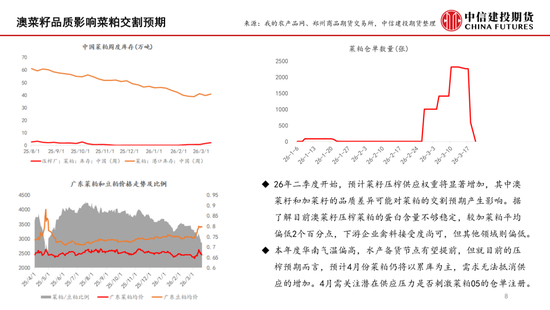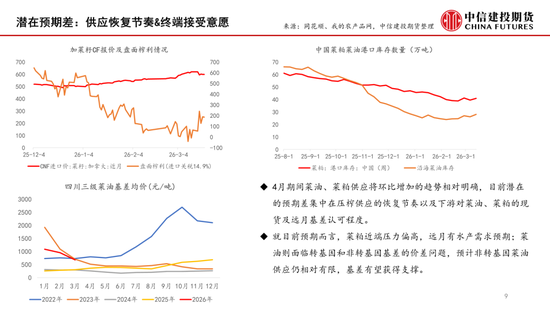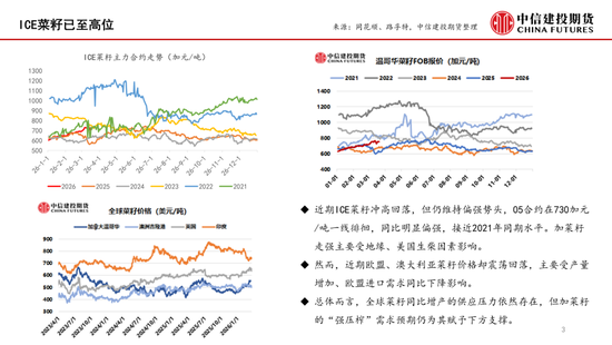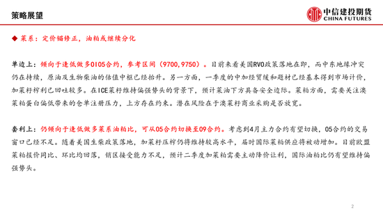 单边上:倾向于逢低做多OI05合约,参考区间(9700,9750)。目前来看美国RVO政策落地在即,而中东地缘冲突仍在持续,原油及生物柴油的估值中枢已经抬升。另一方面,一季度的中加经贸缓和题材已经基本得到市场计价,加菜籽榨利已回吐较多。在ICE菜籽维持偏强势头的背景下,预计菜油下方具备安全边际。菜粕方面,需要关注澳菜粕蛋白偏低带来的仓单注册压力,上方存在约束。潜在风险在于澳菜籽商业采购是否放宽。
